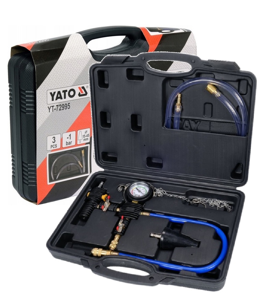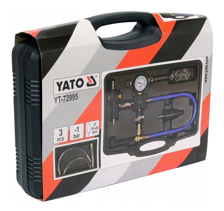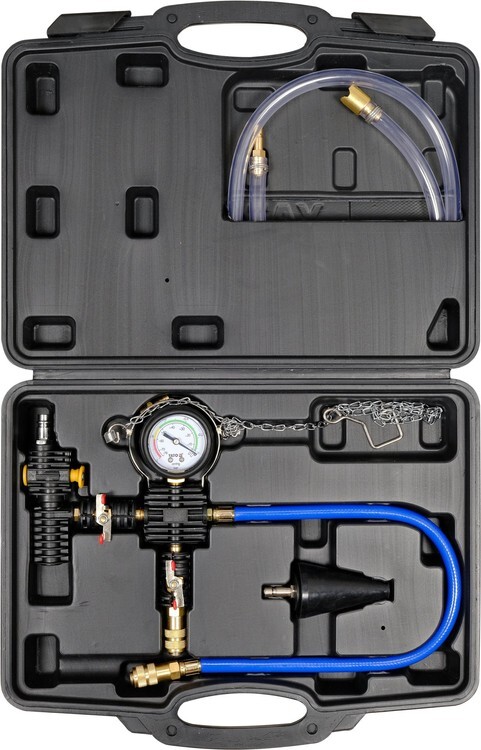 Zestaw YT-72995 przeznaczony jest do szybkiego podciśnieniowego napełniania płynem chłodzącym układu bez wytwarzania pęcherzyków powietrza. Eliminuje to konieczność odpowietrzania układu chłodzenia, skracając czas obsługi pojazdu. Zestaw zawiera manometr w gumowej osłonie, przewód doprowadzający płyn chłodniczy oraz stożek/reduktor o zakresie obsługiwanych średnic od 15 do 45 mm. Całość zapakowana w wytrzymałą walizkę.