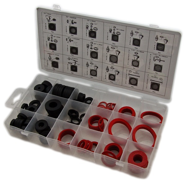 Zestaw uszczelek hydraulicznych gumowych i z wulkanizowanej tektury do instalacji zimnej i ciepłej wody.