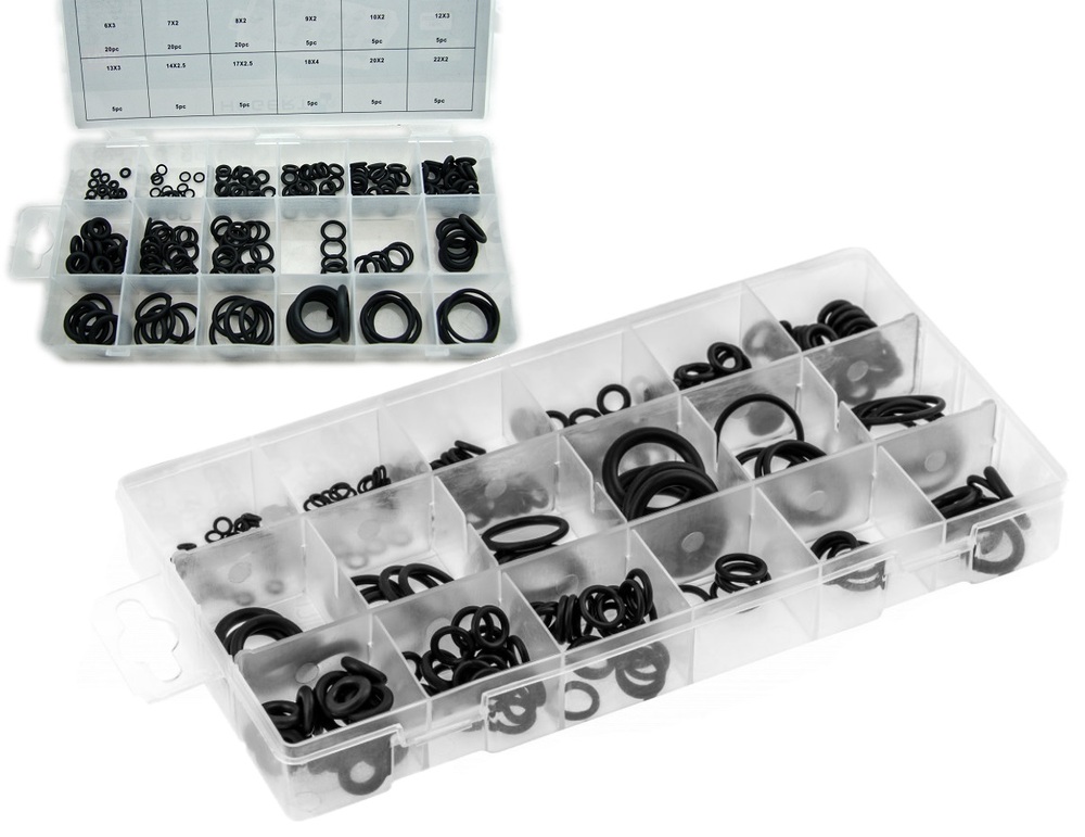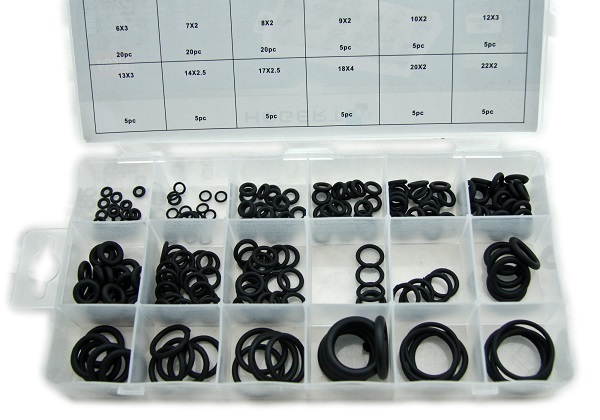 Zestaw profesjonalnych uszczelek okrągłych wykonanych z kauczuku typu NBR (elastomer nitrylowy) do stosowania przy instalacjach gazowych i klimatyzacyjnych oraz pracach motoryzacyjnych.