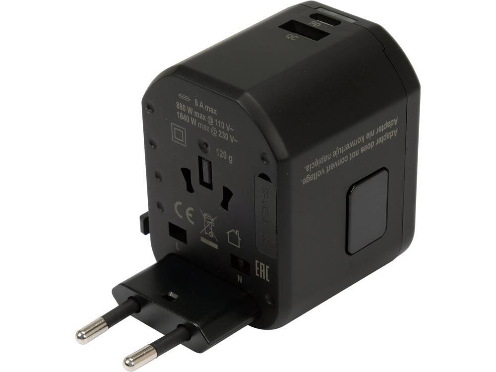 Adapter z wbudowana ładowarką z dwoma portami USB w technologii szybkiego ładowania przystosowany do standardu ponad 150 krajów.