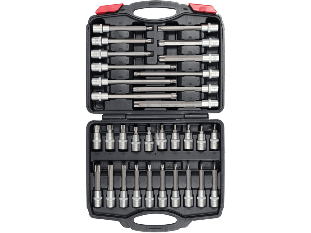 Zestaw 32 kluczy trzpieniowych torx przeznaczonych do odkręcania śrub. Stosowane do obsługi samochodów, maszyn budowlanych, produkcyjnych i rolniczych.