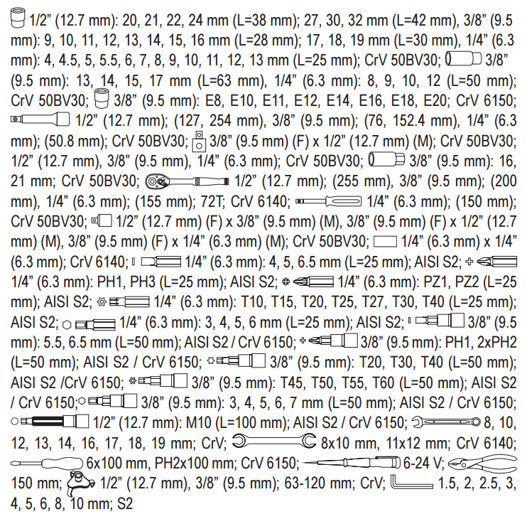 Profesjonalny zestaw narzędziowy, który został opracowany pod kątem potrzeb wyspecjalizowanych serwisów samochodowych i mechanicznych. Klucze nasadowe, jak i napęd nasadek, zostały wykonane z wytrzymałej, narzędziowej stali chromowo-wanadowej CrV 50BV3.