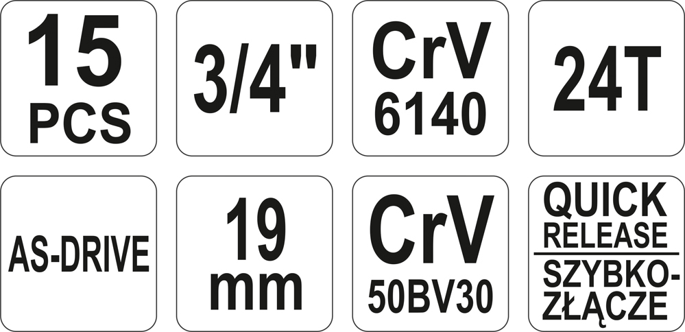 ZESTAW NARZĘDZIOWY KLUCZY NASADOWYCH 3/4'' 15szt. YATO YT-1334