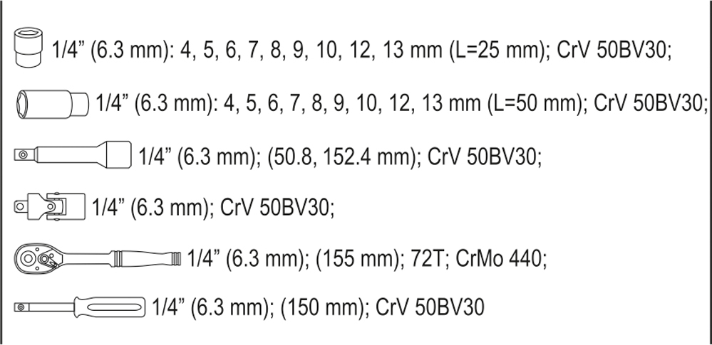 nasadki 1/4” (6.3 mm): 4, 5, 6, 7, 8, 9, 10, 12, 13 mm (L=25 mm)