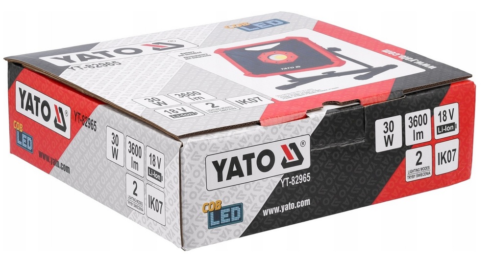 Posiada 2 tryby pracy o natężeniu światła 5000 lub 2500 lumenów. Zasilany akumulatorami platformy YATO 18 V.