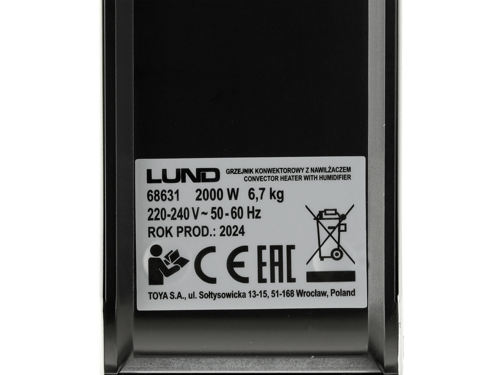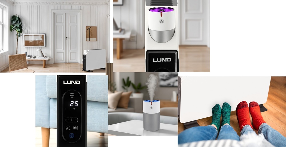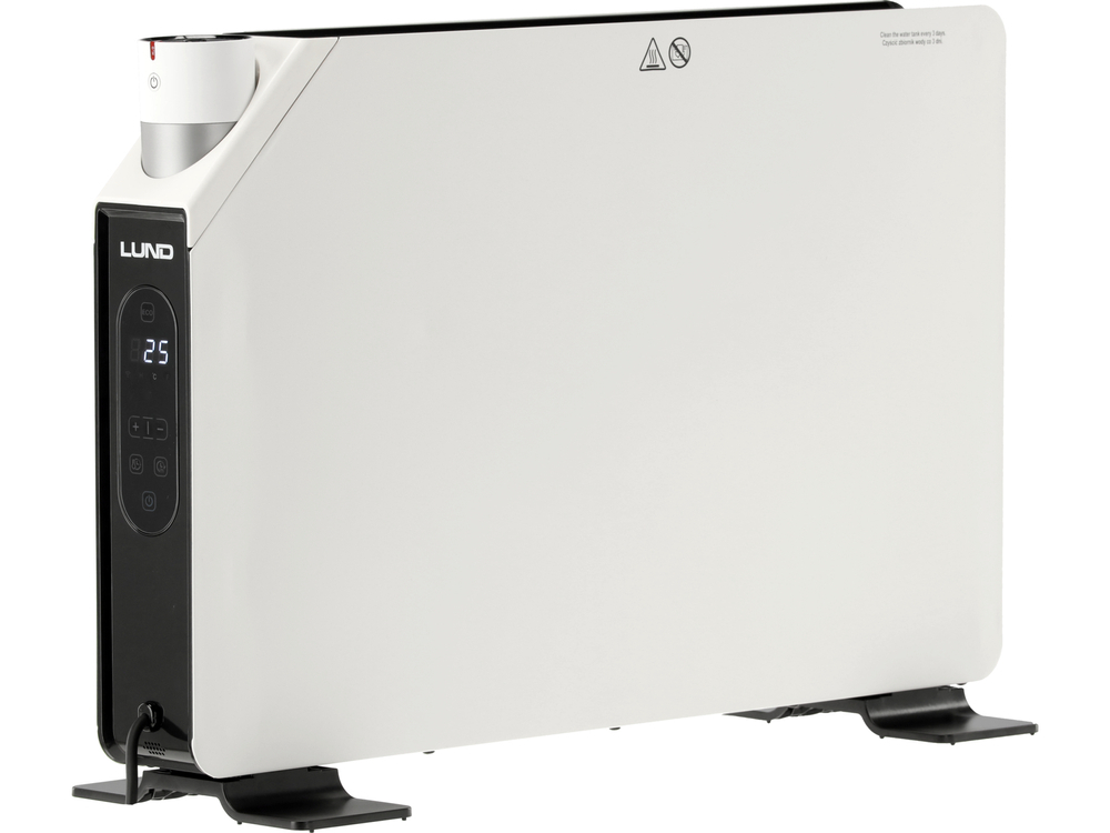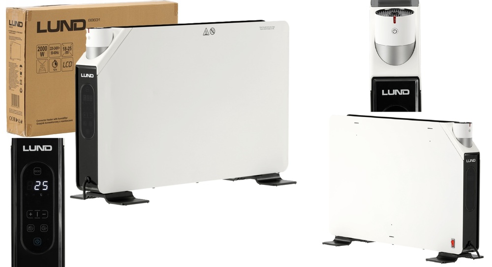 Grzejnik konwektorowy marki LUND z unikalnym na rynku nawilżaczem łączy wysoką wydajność z bezpieczeństwem i nowoczesnym designem. Dzięki dwóm poziomom mocy i płynnej regulacji temperatury urządzenie zapewnia szybkie i efektywne ogrzewanie małych i średnich pomieszczeń.
