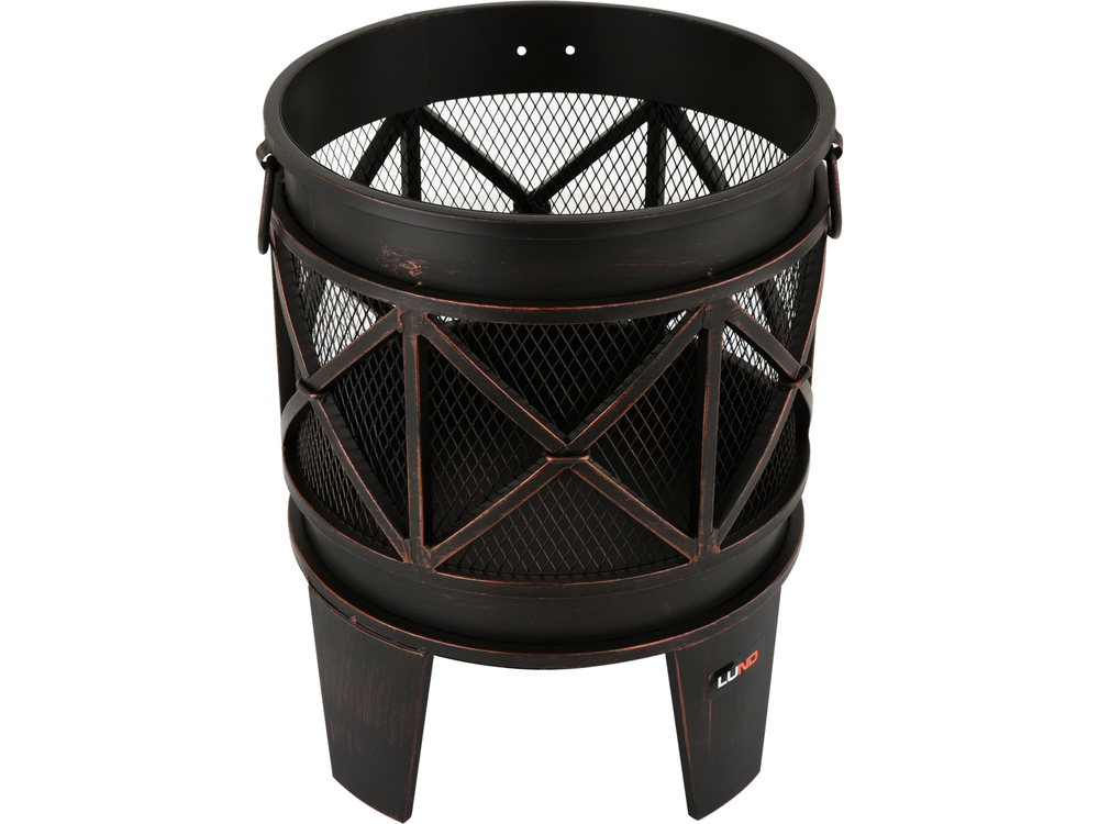 Design z stalowym dekorem i siatką nadaje palenisku elegancki wygląd, który doskonale wpisuje się w aranżację ogrodu. Nie tylko spełnia funkcję praktyczną, ale również stanowi atrakcyjny element dekoracyjny.