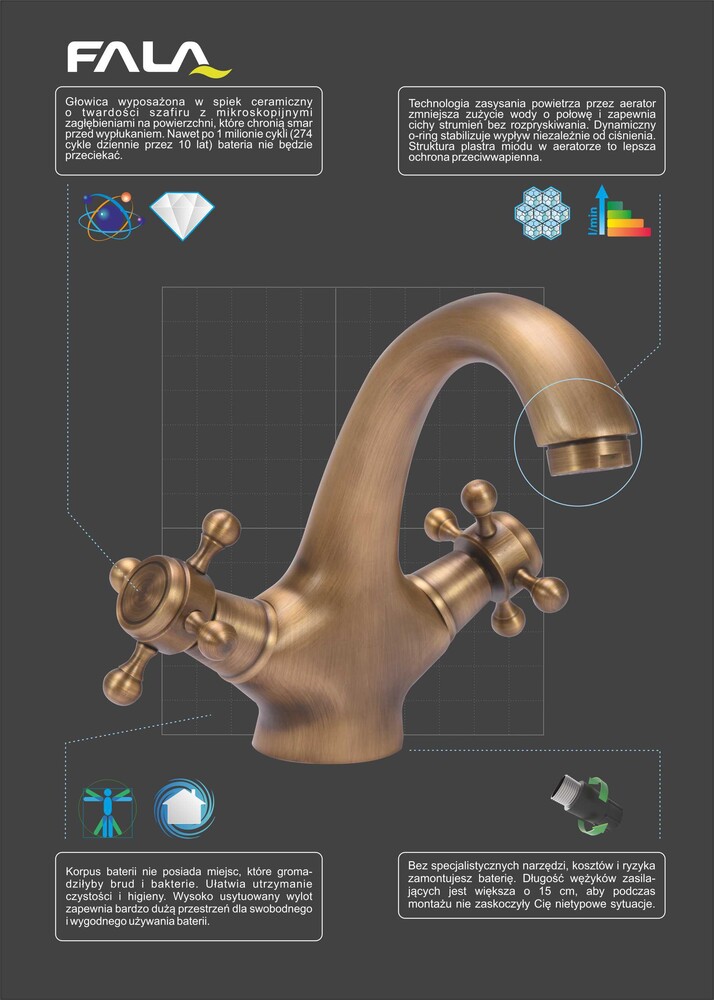 BATERIA UMYWALKOWA STOJĄCA KRAN RETRO BRONZE 1 ANTYCZNE ZŁOTO MOSIĄDZ FALA 75827