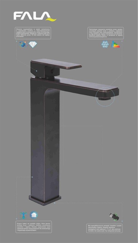W baterii znajduje się głowica wyposażona w spiek ceramiczny CORUNDox o twardości szafiru z mikroskopijnymi zagłębieniami na powierzchni NANOcave, które chronią smar przed wypłukaniem. Aerator szwajcarskiej firmy (Neoperl) o strukturze plastra miodu to lepsza ochrona przeciwwapienna i odporność na zgniatanie. Dzięki ECOflow zasysane jest powietrze i zmniejsza się zużycie wody o ponad połowę oraz zapewniony jest cichy strumień bez rozpryskiwania. Korpus baterii CLEANbody nie posiada zakamarków, które gromadziłyby brud i bakterie, a dzięki ERGOsize wysoko usytuowany wylot zapewnia bardzo dużą przestrzeń dla swobodnego używania baterii. Unikalne rozwiązania techniczne SMARTnut sprawi, że nie posiadając odpowiednich kluczy ani doświadczenia skutecznie i trwale zamontujesz baterię. Elastyczne wężyki w oplocie ze stali nierdzewnej są dłuższe o 15 cm, aby podczas montażu nie zaskoczyły Cię nietypowe sytuacje. Moda się zmienia, a gwarancja będzie trwać - 5 lat gwarancji na szczelność nie tylko samego korpusu, ale także głowicy.