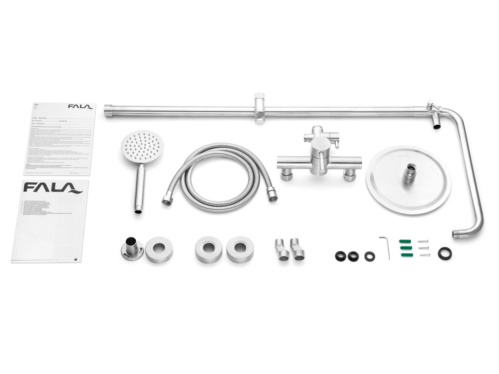 Zawartość zestawu: bateria, słuchawka prysznicowa, wąż prysznicowy z uszczelkami, deszczownica, drążek prysznicowy, krzywki z rozetami i uszczelkami