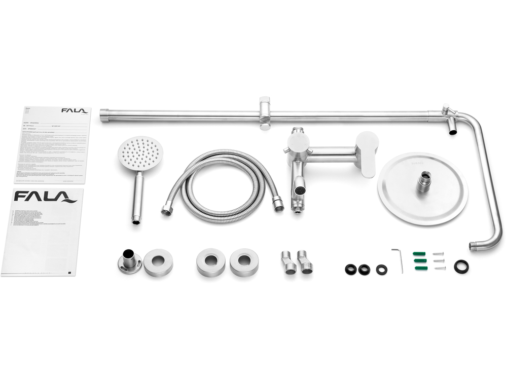 Zawartość zestawu: bateria, słuchawka prysznicowa, wąż prysznicowy z uszczelkami, deszczownica, drążek prysznicowy, krzywki z rozetami i uszczelkami