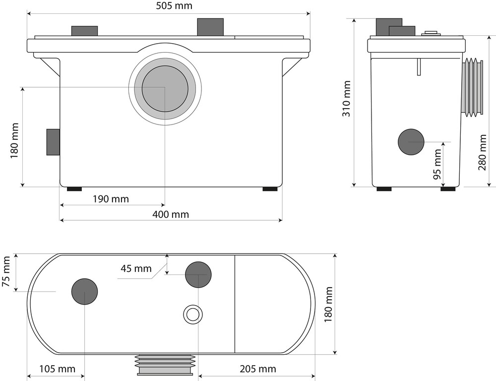 Wydajna pompa sanitarna z rozdrabniaczem wyposażona w cichy silnik o mocy 600 W. Pompa daje możliwość instalacji urządzeń sanitarnych tam, gdzie nie ma możliwości podłączenia ich do grawitacyjnej kanalizacji sanitarnej.