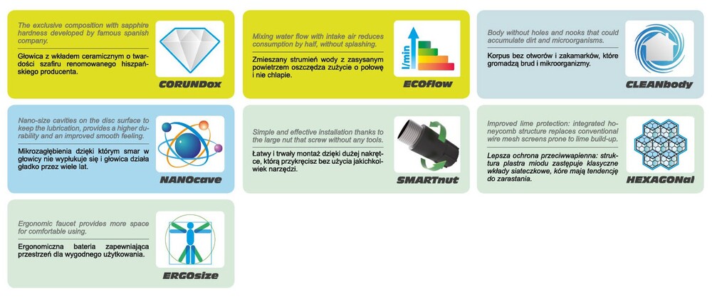 W baterii znajduje się głowica wyposażona w spiek ceramiczny CORUNDox o twardości szafiru z mikroskopijnymi zagłębieniami na powierzchni NANOcave, które chronią smar przed wypłukaniem. Aerator szwajcarskiej firmy (Neoperl) o strukturze plastra miodu to lepsza ochrona przeciwwapienna i odporność na zgniatanie. Dzięki ECOflow zasysane jest powietrze i zmniejsza się zużycie wody o ponad połowę oraz zapewniony jest cichy strumień bez rozpryskiwania. Korpus baterii CLEANbody nie posiada zakamarków, które gromadziłyby brud i bakterie, a dzięki ERGOsize wysoko usytuowany wylot zapewnia bardzo dużą przestrzeń dla swobodnego używania baterii. Unikalne rozwiązania techniczne SMARTnut sprawi, że nie posiadając odpowiednich kluczy ani doświadczenia skutecznie i trwale zamontujesz baterię. Elastyczne wężyki w oplocie ze stali nierdzewnej są dłuższe o 15 cm, aby podczas montażu nie zaskoczyły Cię nietypowe sytuacje.