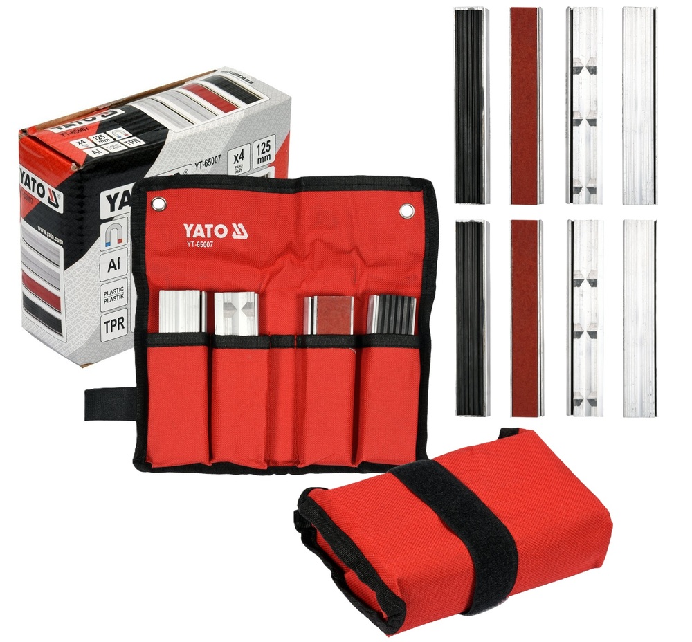 Zawartość zestawu: aluminiowe z pryzmą do mocowania okrągłych elementów, aluminiowe nacinane, aluminiowe z okleiną z tworzywa, aluminiowe z rowkowaną gumą