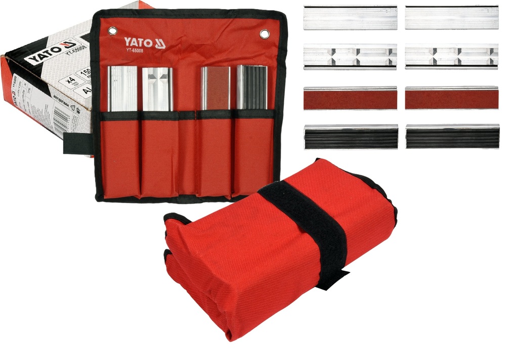 Zawartość zestawu: aluminiowe z pryzmą do mocowania okrągłych elementów, aluminiowe nacinane, aluminiowe z okleiną z tworzywa, aluminiowe z rowkowaną gumą