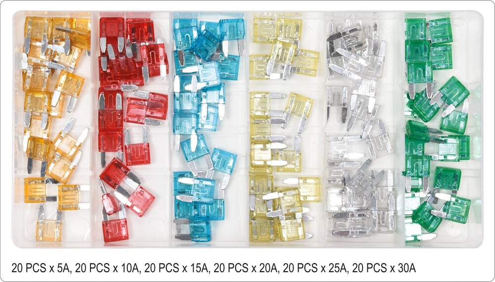 Zawartość zestawu: bezpieczniki x120 (5A x20, 10A x20, 15A x20, 20A x20, 25A x20, 30A x20)