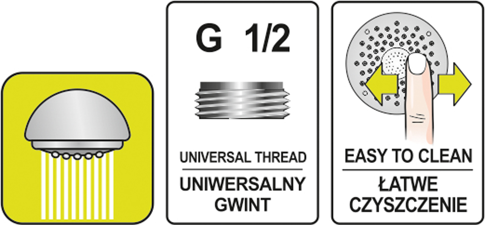 Klasyczna słuchawka prysznicowa jednofunkcyjna, zakończona elastycznymi wypustkami, które ułatwiają usunięcie osadzającego się kamienia. Dzięki standardowej końcówce 1/2" pasuje do typowych węży prysznicowych.
