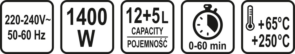 - Intuicyjna regulacja temperatury (65-250°C) i czasu pracy (0-60 min)