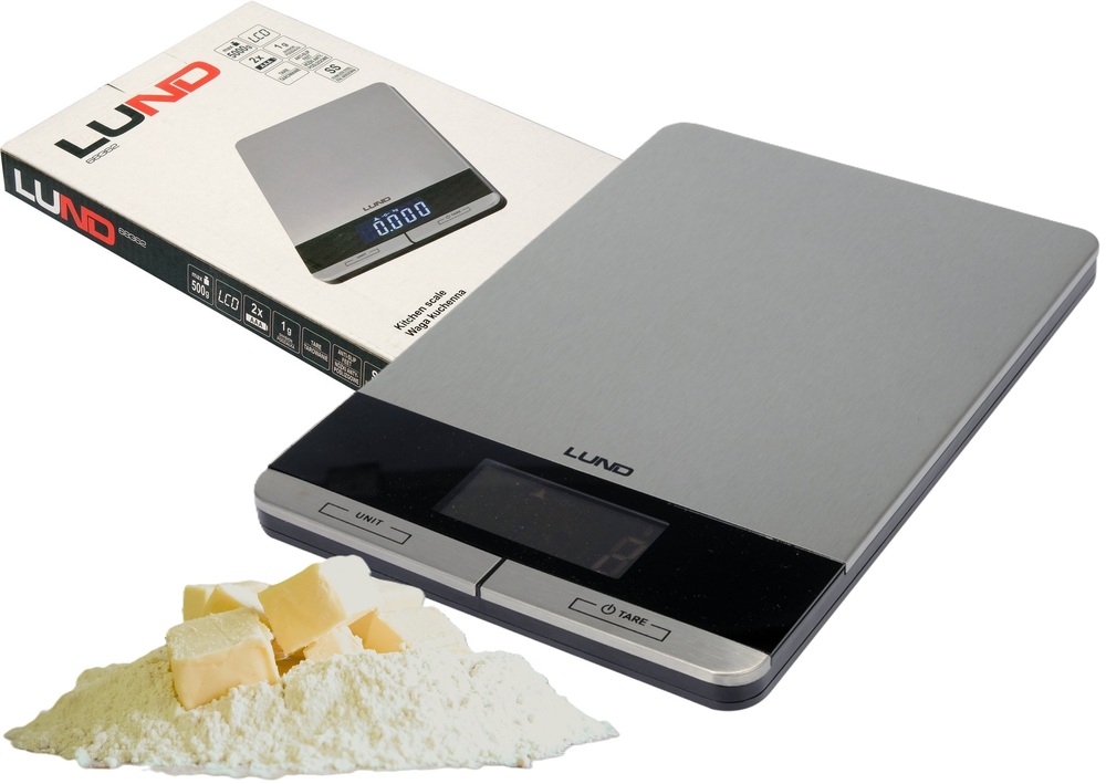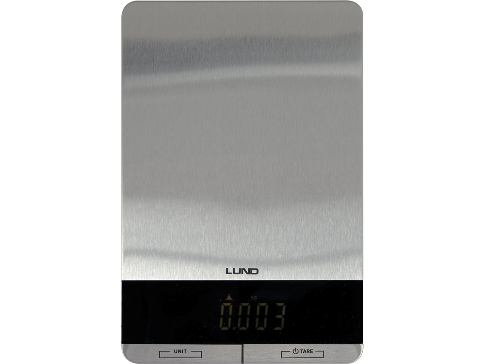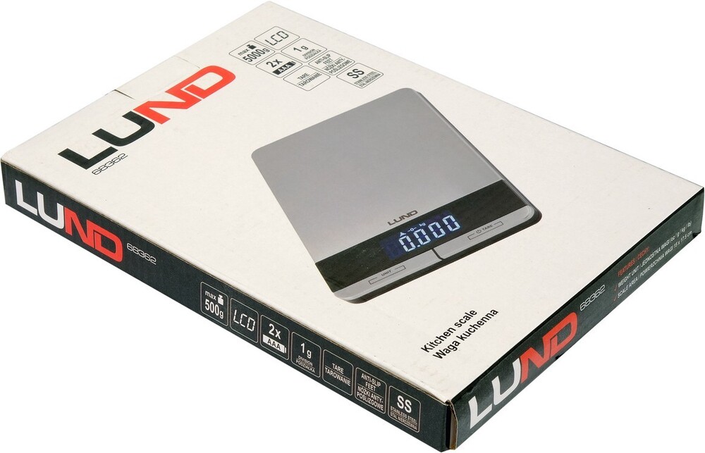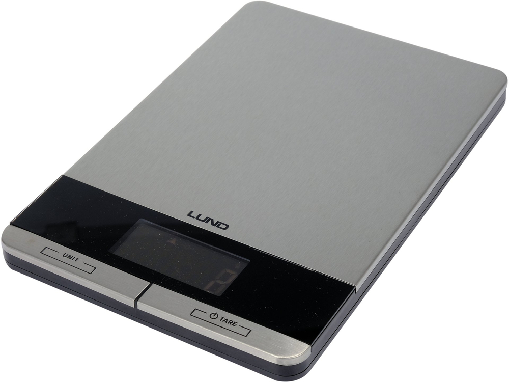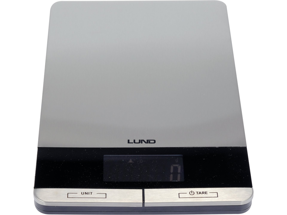 Waga kuchenna LUND z płytą wykonaną ze stali nierdzewnej. Wyposażona w czytelny wyświetlacz LCD pokazujący 4 jednostki wagi do wyboru oraz wskaźniki przeciążenia i niskiego poziomu baterii. Maksymalne obciążenie wynosi aż 5 kg.