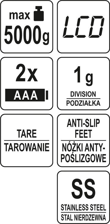 - 4 jednostki: oz/g/kg/lb (uncje/gramy/kilogramy/funty)
