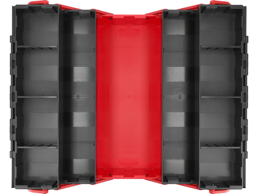 Wyposażona w pięć pojemnych półek - komorę główną oraz po dwie boczne - umożliwia wygodne rozmieszczenie i szybki dostęp do potrzebnych elementów. Dzięki maksymalnemu obciążeniu 30 kg skrzynka bez problemu pomieści narzędzia ręczne, drobne akcesoria czy elementy montażowe.