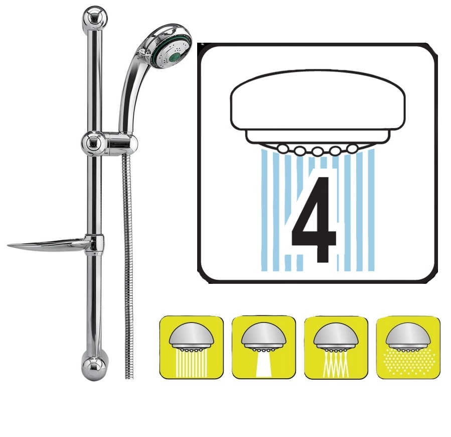 Słuchawka prysznicowa posiada standardowy gwint G1/2 ", wykonana z tworzywa sztucznego ABS pokrytego chromem, 4 funkcje regulacji strumienia. Gumowe kanaliki zapobiegają gromadzeniu się kamienia. Wąż prysznicowy został wykonany ze stali nierdzewnej, posiada pojedynczy oplot, długość 150 cm oraz standardowy gwint G 1/2 ". Mydelniczka wykonana z tworzywa sztucznego ABS pokrytego chromem.