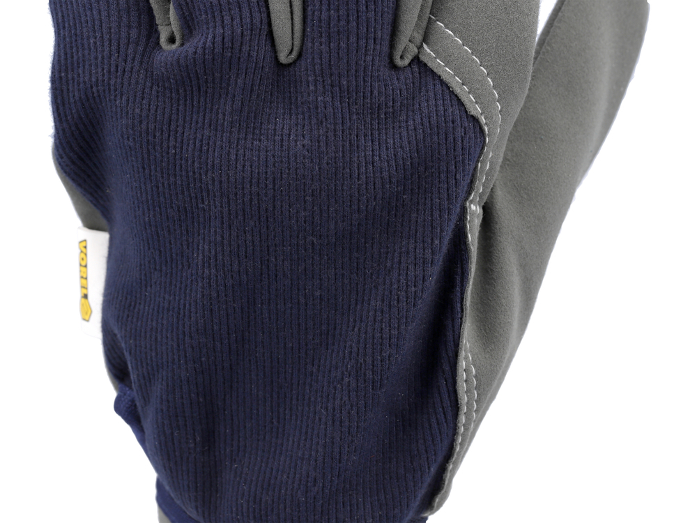 Rękawice robocze wykonane z szarej skóry syntetycznej Amara, oraz z dzianiny bawełnianej w kolorze granantowym. Sprawdzą się do przenoszenia brudzących elementów, do prac porządkowych i konstrukcyjnych.