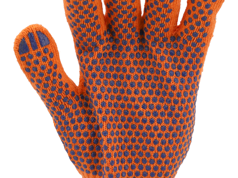 Rękawice bawełniano - poliestrowe nakrapiane w części chwytnej PVC, co poprawia chwytność i zwiększa odporność na ścieranie.