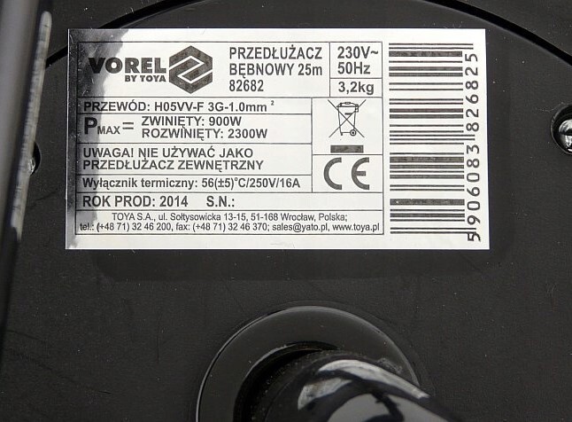Maks. obciążenie (przewód całkowicie zwinięty): 900 W