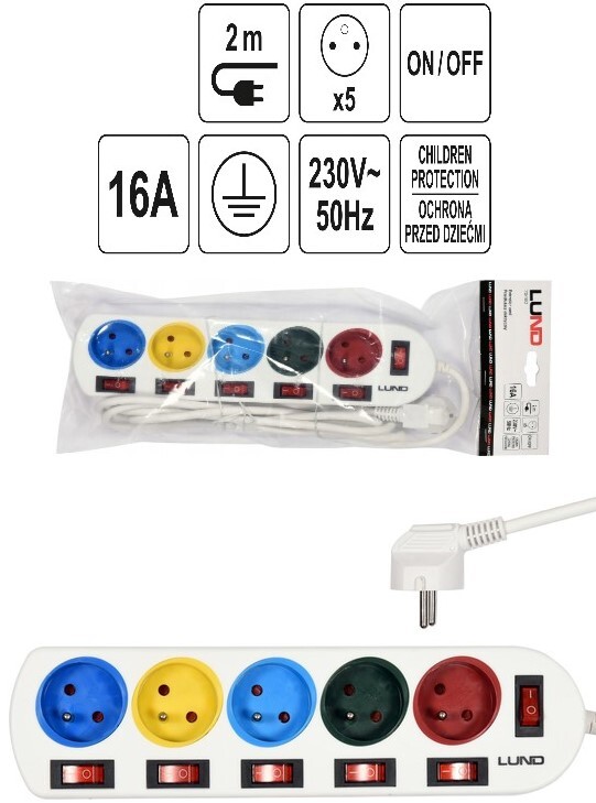 Listwa zasilająca marki Lund o numerze z wyłącznikiem głównym oraz 5-ma indywidualnie wyłączanymi gniazdkami z uziemieniem doskonale sprawdzi się w zasilaniu domowej elektroniki.