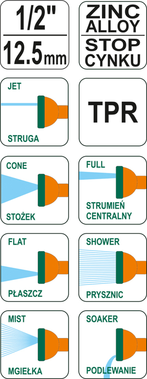 Rodzaj strumienia: prysznic, stożek, strumień centralny, płaszcz, struga, podlewanie, mgiełka
