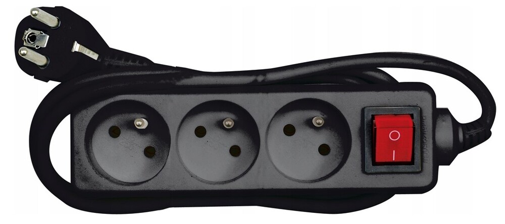 Klasyczny przedłużacz listwowy z gniazdami z uziemieniem oraz z wyłącznikiem odcinającym zasilanie we wszystkich gniazdach.