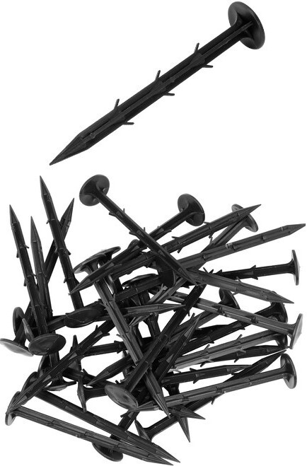 Zestaw 100 polipropylenowych kołków do zabezpieczania agrowłókniny i agrotkaniny.