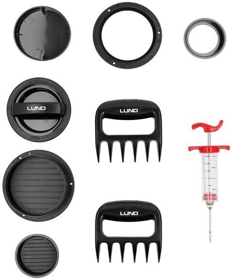 Zawartość zestawu: pazury do szarpania mięsa, prasa do hamburgerów, nastrzykiwarka do mięsa