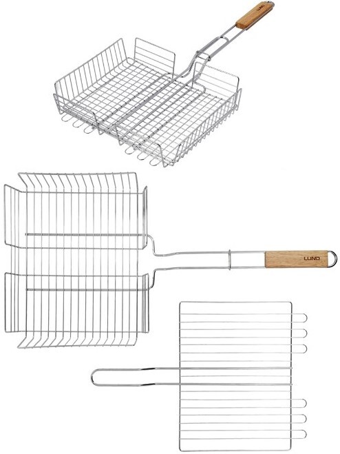 Przenośny ruszt do grillowania, składający się z kosza i płaskiej kratki, utrzymuje skladniki w jednym miejscu, ograniczając ich spadanie z kratek grilla. Ułatwia przewracanie większej ilości jedzenia za jednym razem.