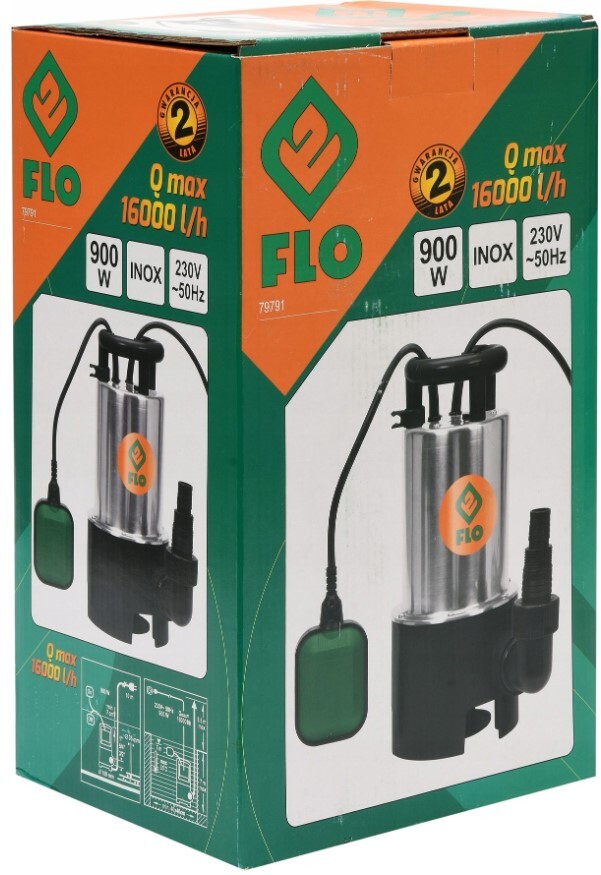 Wydajna pompa zatapialna FLO 900W z obudową z wytrzymałej stali nierdzwnej ( inox ) służąca do przepompowywania, napowietrzania i cyrkulacji wody czystej oraz zanieczyszczonej ze zbiorników na deszczówkę, studni.