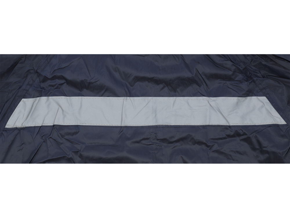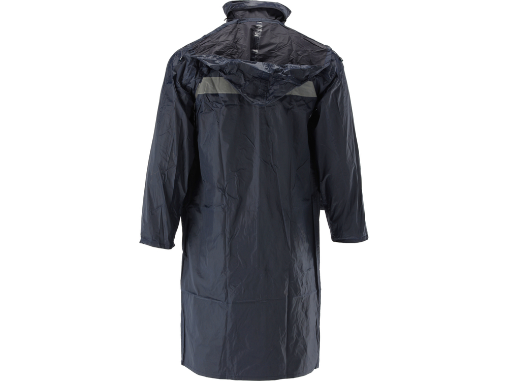 Lekki płaszcz przeciwdeszczowy z poprawiającymi widoczność pasami odblaskowymi, z dwiema dużymi kieszeniami i regulowanym kapturem.
