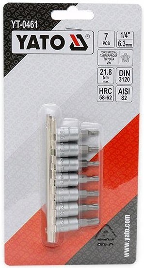 Zestaw Yato YT-0461 to gwarancja precyzji i niezawodności w serwisie samochodowym. Skutecznie odkręcisz nim śruby typu Torx Special Tamperproof w najnowszych modelach Toyoty i VW.